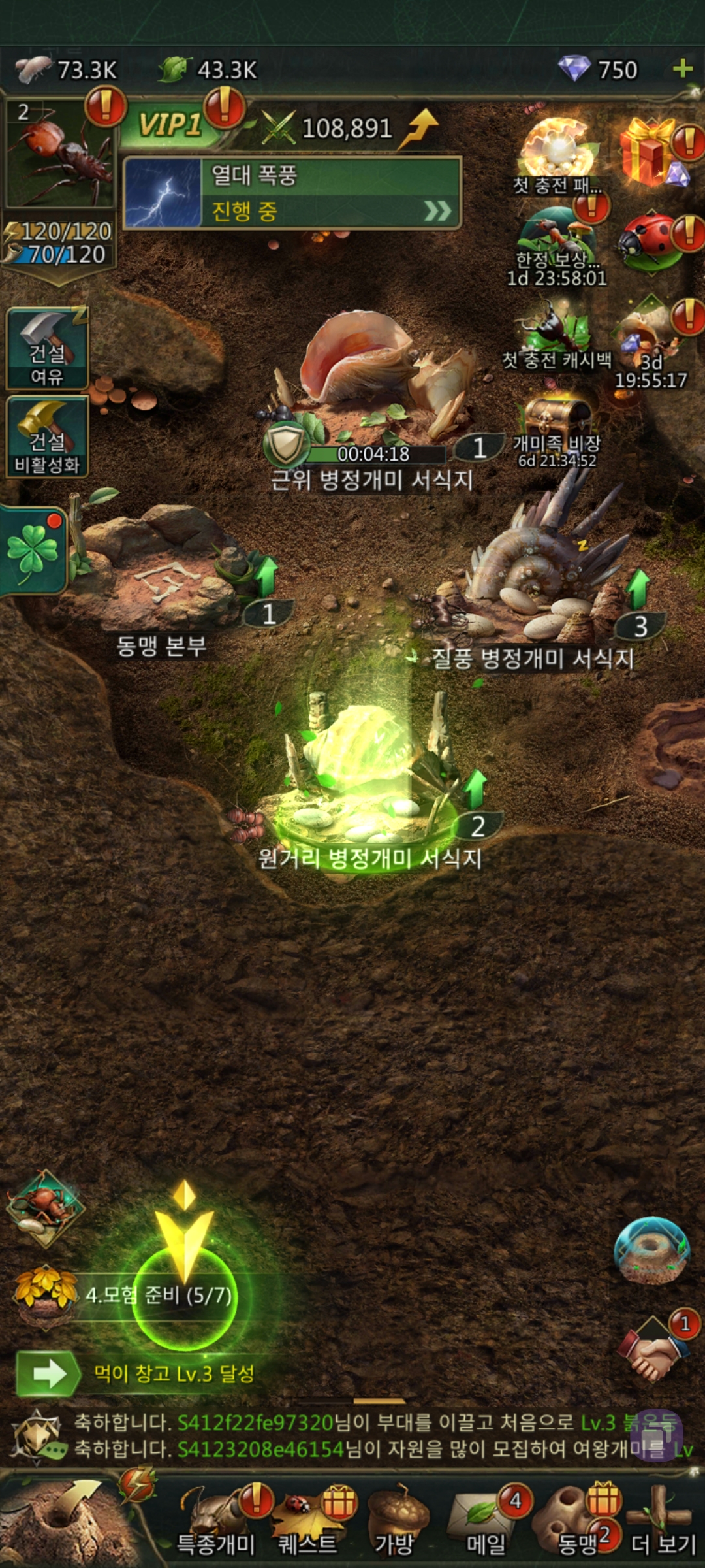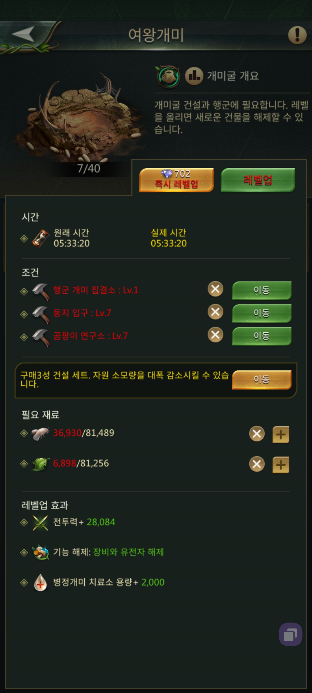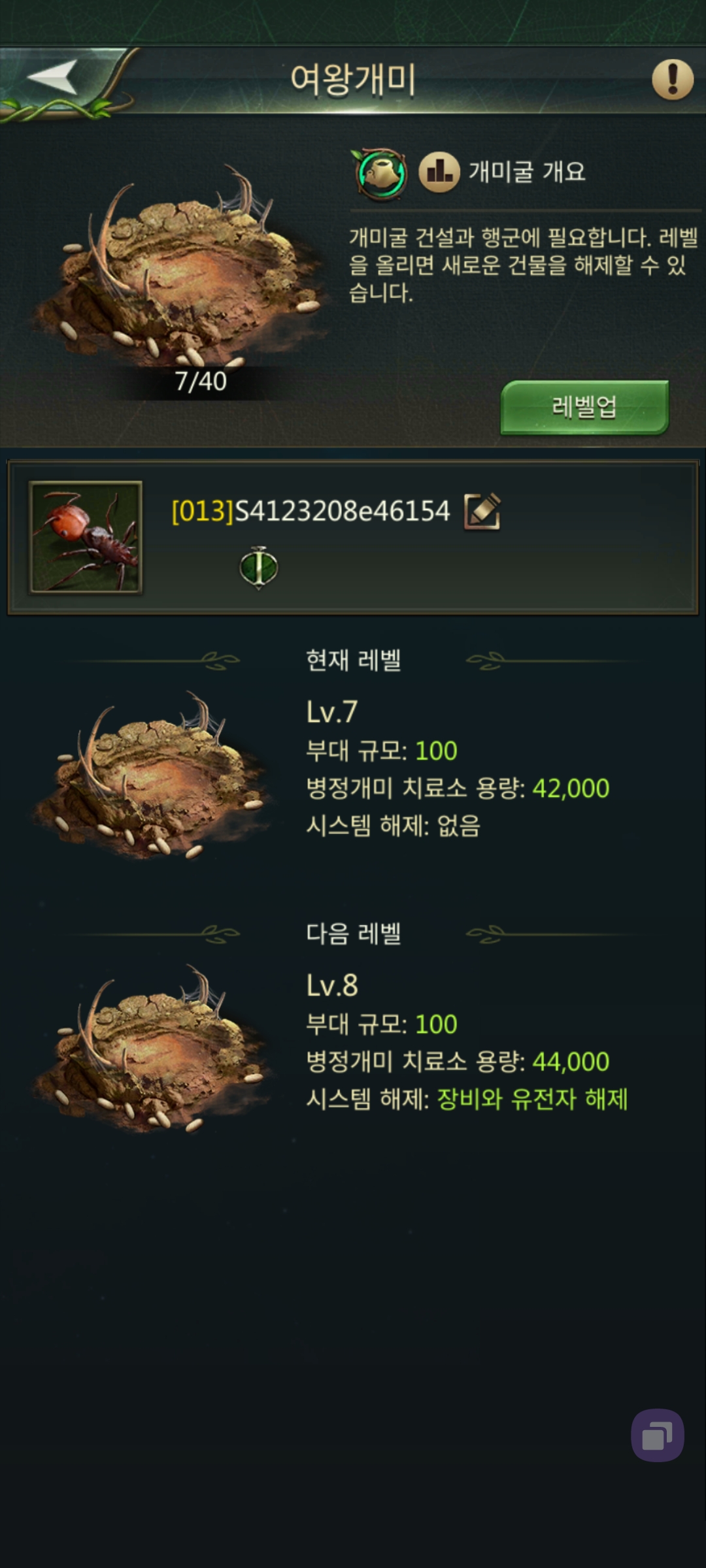 조건창에 있는 빨간색은 개미 마을에 설치할 수 있는 건물 이름들로 저기 적힌 레벨만큼 올려줘야 여왕개미 레벨을 올릴 수 있습니다. 선행조건인 셈이죠. 레벨7까지 게임이 시키는 대로만 하면 선행조건 어렵지 않게 채울 수 있습니다.