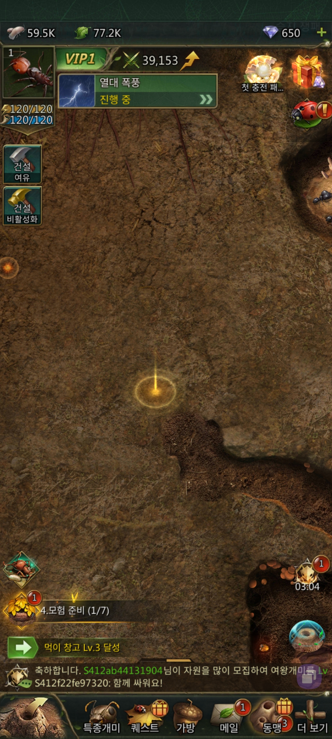 여왕개미 옆에 숫자 7이 보이시나요? 우리의 목표는 이 숫자를 12로 만드는 겁니다. 얼마나 뇌를 빼놓고 해도 되는지 시험해보기위해 남매 둘을 매달고서 했습니다...(벌써부터 애기들 앞에서 게임이나 하고 잘하는 짓이다! 부디 양가 어르신들이 내 글을 보지 말아야할텐데...) 천방지축 두 남매를 달고서도 20분도 되지않아 레벨 7을 찍었어요! 아이들의 방해와 산더미처럼 쌓인 집안일만 없다면 하루 만에도 레벨 12 찍을 수 있을 듯합니다! 자 그러면 어떻게 해야 여왕개미 레벨을 올리느냐??!!! 개미를 손가락으로 눌러봅니다. 조금 징그럽지만 참고 눌러봅니다. 퍼즐 오브 삐-같은 비슷한 게임들은 보통 삐까뻔쩍한 건물이나 요새 그려놓고 본부니 점령지니 하던데......비슷한 게임들 중에서 독특해보이고 싶었다면 그 목표는 달성한 듯 합니다. 그런데 벌레면 어떻고 펜션이면 어떻습니까 보상만 잘 주면 그만이지.