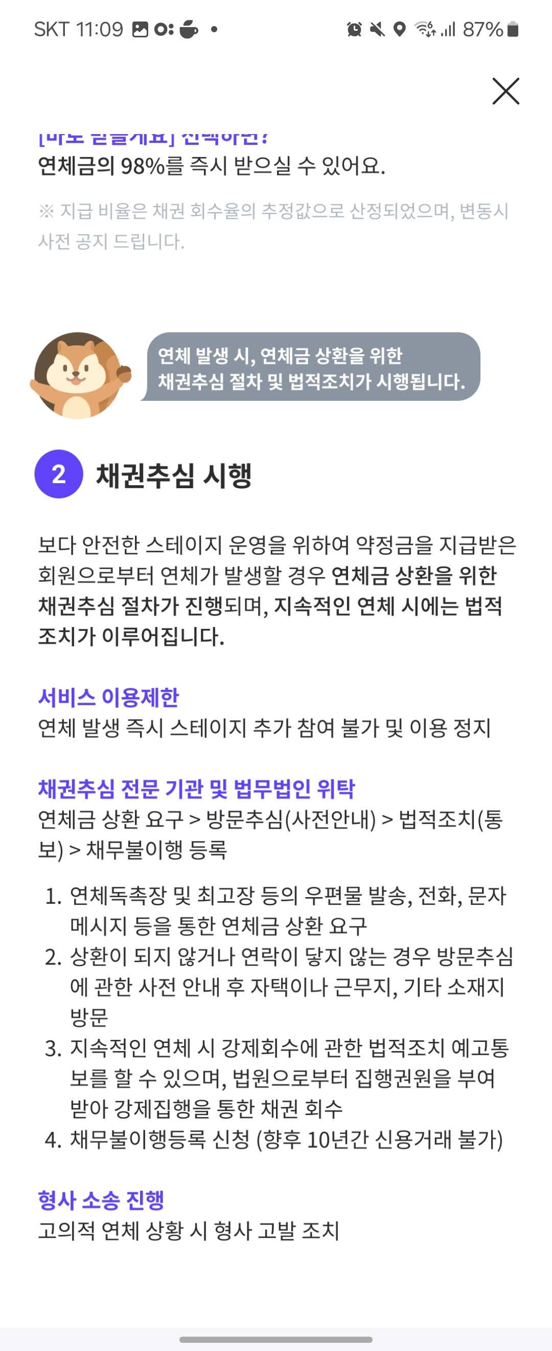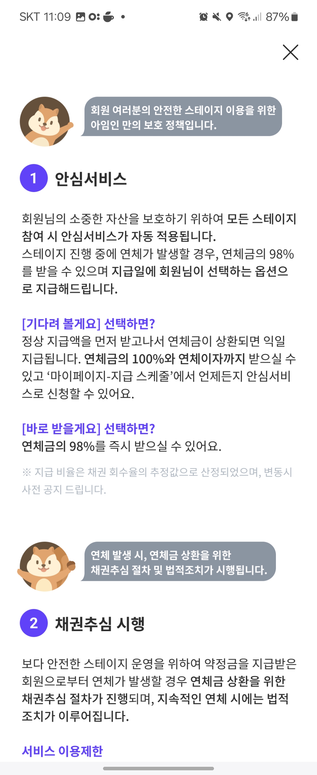 하지만 법원이랑 얽히면 으레 그렇듯이 오래 걸리죠. 스테이지 참여자 중에 연체자가 생기는 불상사가 없기를 바라겠지만 저는 생기면 98% 돌려받는 쪽을 선택할까해요. 그러면 음..마지막 사람은 튀어봤자 별 의미가 없고 대개 첫번째 사람이 먹튀를 할 가능성이 큰데 첫 달에 먹튀하면 저는 10만원 낸 상태겠죠? 10만원의 2%는 2000원. 만약에 혜택으로 포인트를 2000p 이상 받았다면 손해가 거의 없다시피해요. 앱테크를 지속하게 해주는 원동력이 되어주는데 그 정도 손실이야 얼마든지 감내할 수 있습니다. 다만 회사가 폭삭 망해서 앱이 없어질 수 있다는 불상사가...그럴 일 없어야겠지만 있어요. 그래서 저는 너무 뒷순번은 선호하지 않아요. 뒷순번일수록 회사가 망해서 약정금 몽땅 날렸을 때 피해 금액이 커지거든요. 받는 순번 10번째인데 내 순번 안왔는데 어플이 야반도주 해버리면 100만원을 허공에 날릴 수도 있어요. 제 일년치 앱테크 농사가 다 날아가는거죠. 그런 일은 없게 해 주실거죠? 제바아알~~에휴. 어느 정도는 믿고 가는거죠. 지금 하고 있는 다른 앱테크들 믿고 하는 것처럼요. 나 밀크 1705개 모을 때까지 오래오래 함께 갑시다, 아임인!