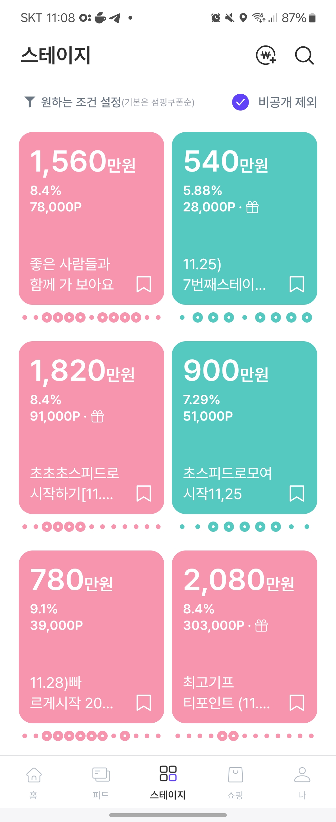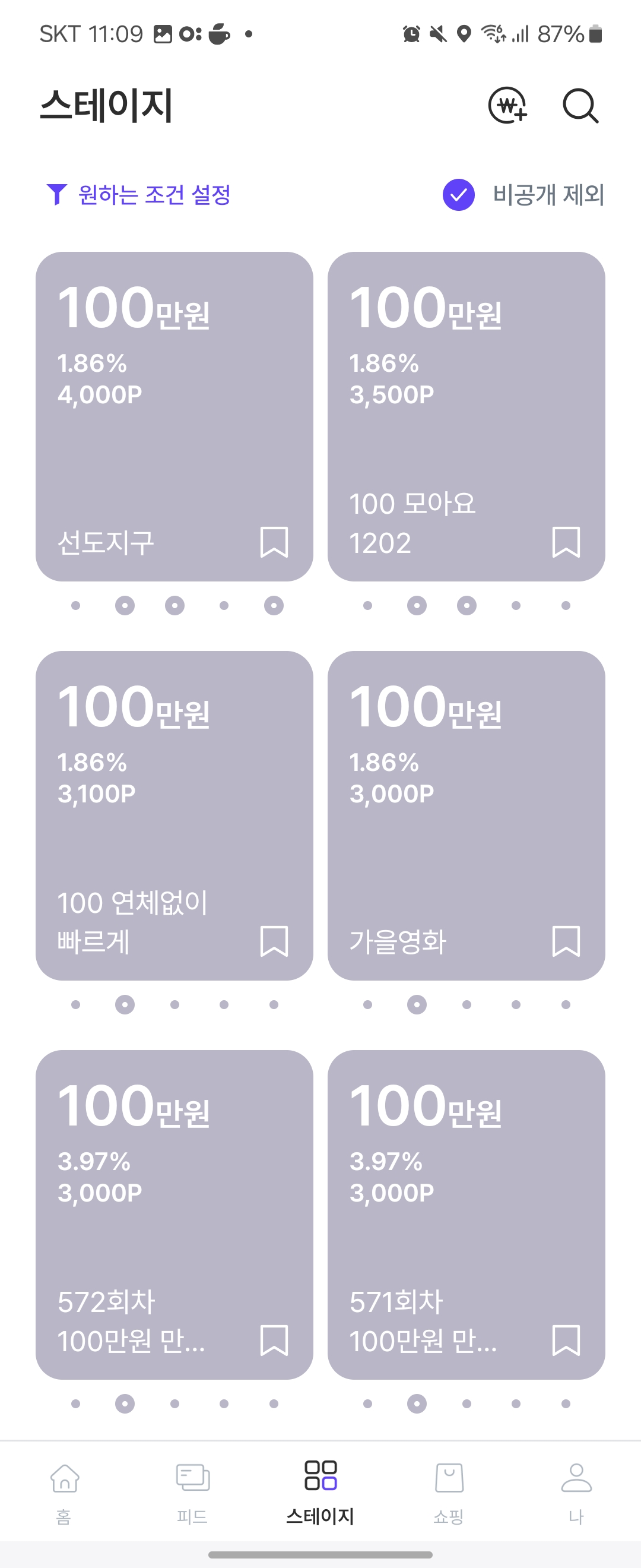 어쨌든 필터를 걸면 저같은 가난뱅이도 참여할 수 있는 저렴이 스테이지들이 나옵니다. ^-^ 그리고 100만원 밑에 이율이랑 포인트가 쓰여있는데요. 저게 다른 스테이지 참여자 분들이 현상금으로 걸어놓은 거에요.