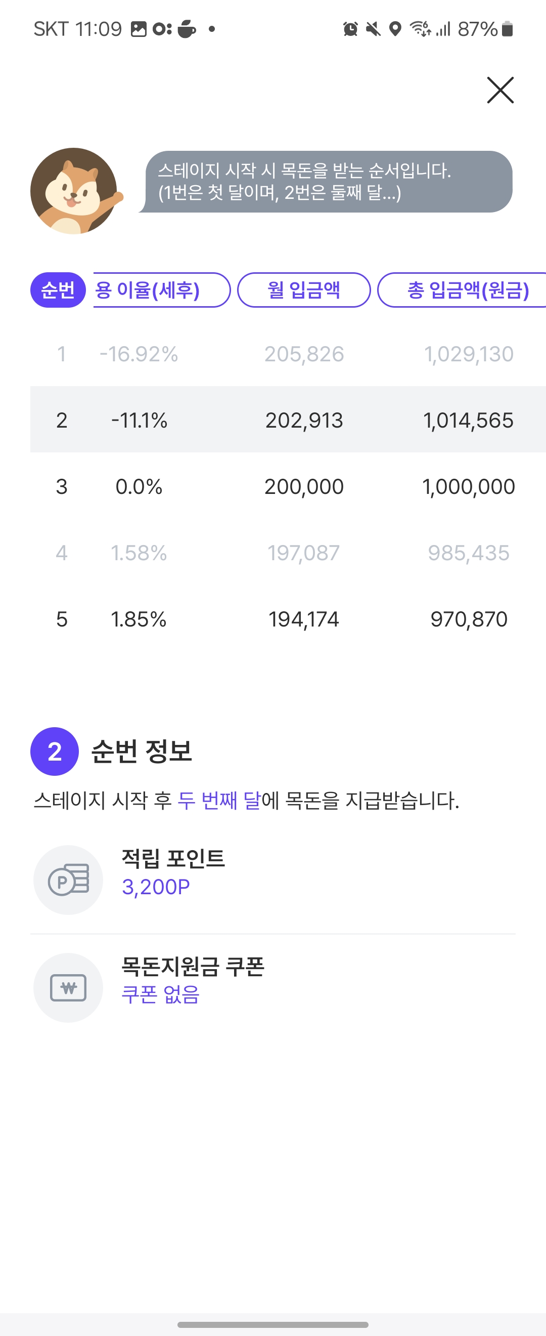 대개 웬만한 스테이지에 제일 바로 스테이지 시작하자마 돈받는 개조아 대장 1번은 차있는 것 같구요. 지금 스샷에서는 2,3,5 세 개의 순번이 비어있네요. 이 세 명이 모여야 시작하는데요. 세 명? 너무 많은가 하실 수도 있는데 저 정도는 금방 차더라고요. 저 2명만 있는 스테이지 들어간 적도 있는데 일주일도 안되서 시작했던 기억이나요. 저도 이렇게 열심히 홍보글 쓰고 있으니 참여자 구하는 텀은 점점 짧아지겠죠. 몇 천만원 짜리 ㅎㄷㄷ 고액 스테이지는 안해봐서 얼마나 걸리는 지 모르겠어요. 몇 천짜리 스테이지 시작자는 좋겠당...부럽당...작고 소듕한 내 연봉보다 많은 돈을 한 달만에 받아가겠지? 하지만 대장이라 무조건 좋고 꼴찌라고 무조건 나쁜 건 아닙니당. 먼저 받아가는 사람은 이자를 내야하고 후 순번은 그 이자를 챙겨가니까요! 이 스테이지에서는 이율이 1.86%라고 쓰여있네요. 웬만한 은행보다 낫지만...또르르...그래도 자기 순번에 100만원 한 번에 받을 수 있잖아요. 아임인에선 친절하게 해당 스테이지의 이율표를 보여주고 있어요. 전에 밀크 계산할 때처럼 둔한 머리 혹사시키지 않아도 돼서 너무 좋았어요.(미안했어, 머리야.) 순번 바로 위 오른쪽에 있는 이율표 확인하기를 눌러보시면...
